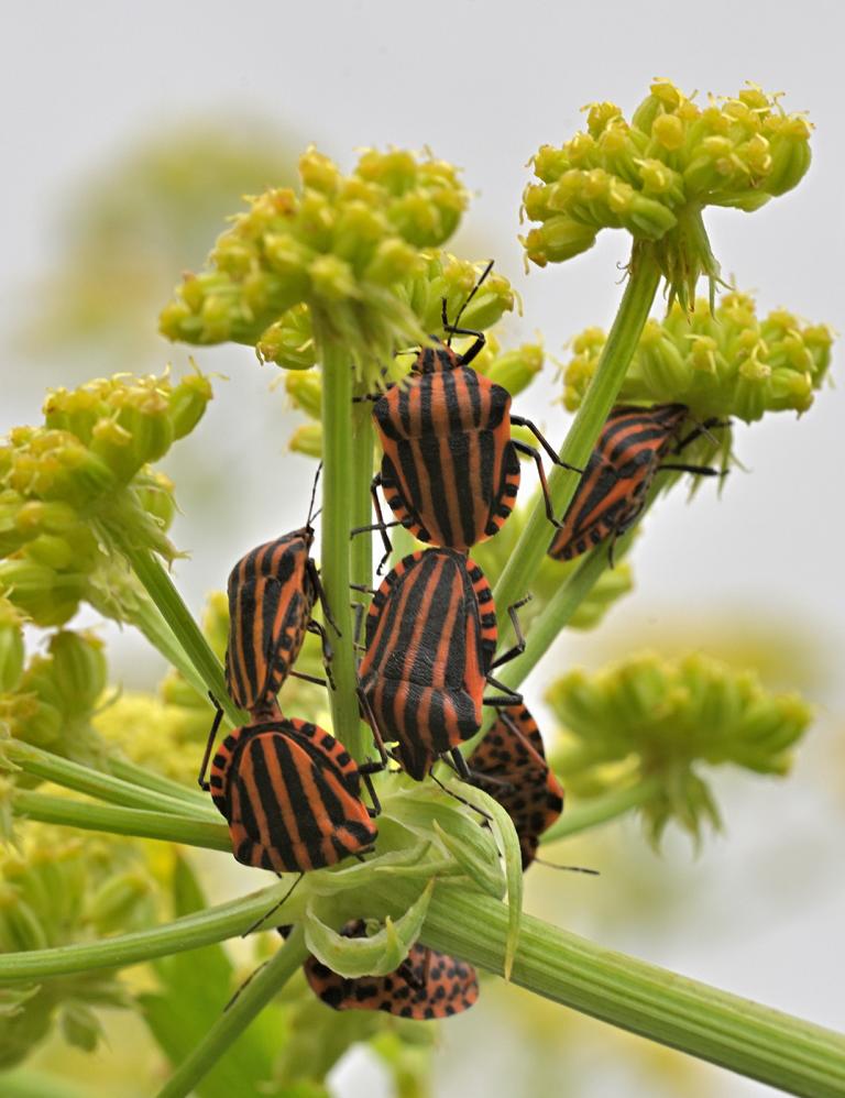 Weit verbreitet und leicht zu erkennen an der Längsstreifung. Hier eine gelbrote Farbvariante. Zu finden sind diese Tiere bevorzugt auf Doldenblütlern (hier Liebstöckel), wo sie auch größere Aggregationen bilden können, die hauptsächlich an reifenden Samen saugen.