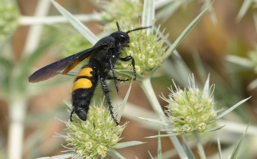 Borstige Dolchwespe (Scolia hirta) auf Feldmannstreu