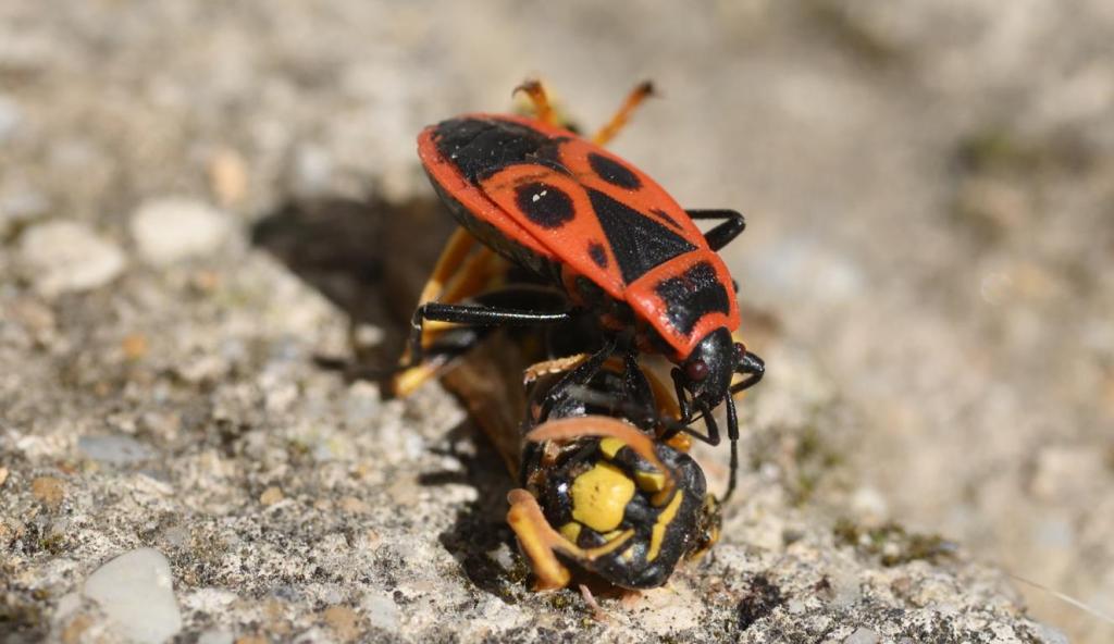 Feuerwanze (Pyrrhocoris apterus) labt sich an einer toten Wespe.