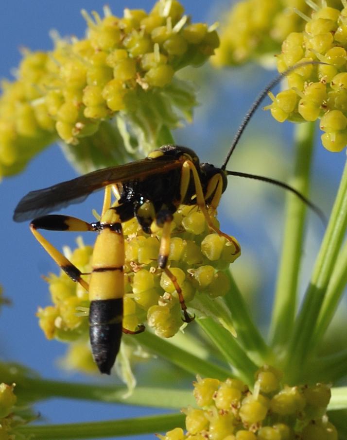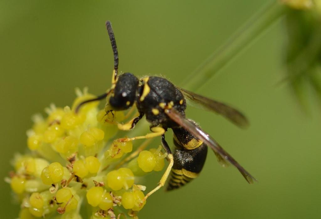 Diese auffällige tiefschschwarze Wespe mit zwei oder mehreren gelben Querbinden (hier am 2. und 3. Hinterleibssegment) ist ein sogenanntes Neozoon, ein klimabedingter Einwanderer in wärmer werdende Regionen. Die Weibchen legen ihre Eier bevorzugt an Engerlingen (Larven von Blatthornkäfern, wie zum Beispiel Rosenkäfern) ab. Zum erfolgreichen Graben bis in eine Tiefe von 40 cm nach Engerlingen sind die stark beborsteten Beine sehr dienlich. Die Larven überwintern im Erdreich und gelangen nach der Verpuppung als fertige Dolchwespen an die Oberfläche.
