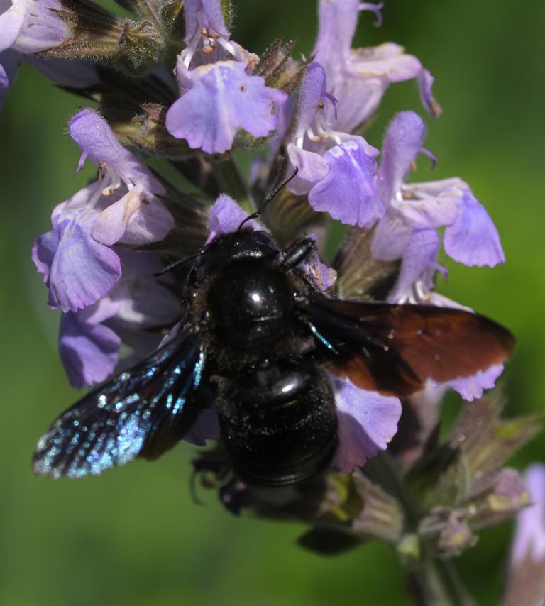 Größte einheimische, solitär lebende Biene. Auffällig blauviolett schimmernde Flügel und metallisch glänzender Körper. Lebt bevorzugt vom Nektar von Lippenblütlern. Aufgrund der starken Kiefer kann sie auch den Blütengrund langer trichterförmiger Blüten durchbeißen, um an deren Nektar zu kommen. Wie der Name schon sagt, nagen die Weibchen Gänge in abgelagertes Holz in denen die Maden heranwachsen.