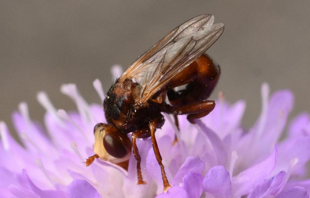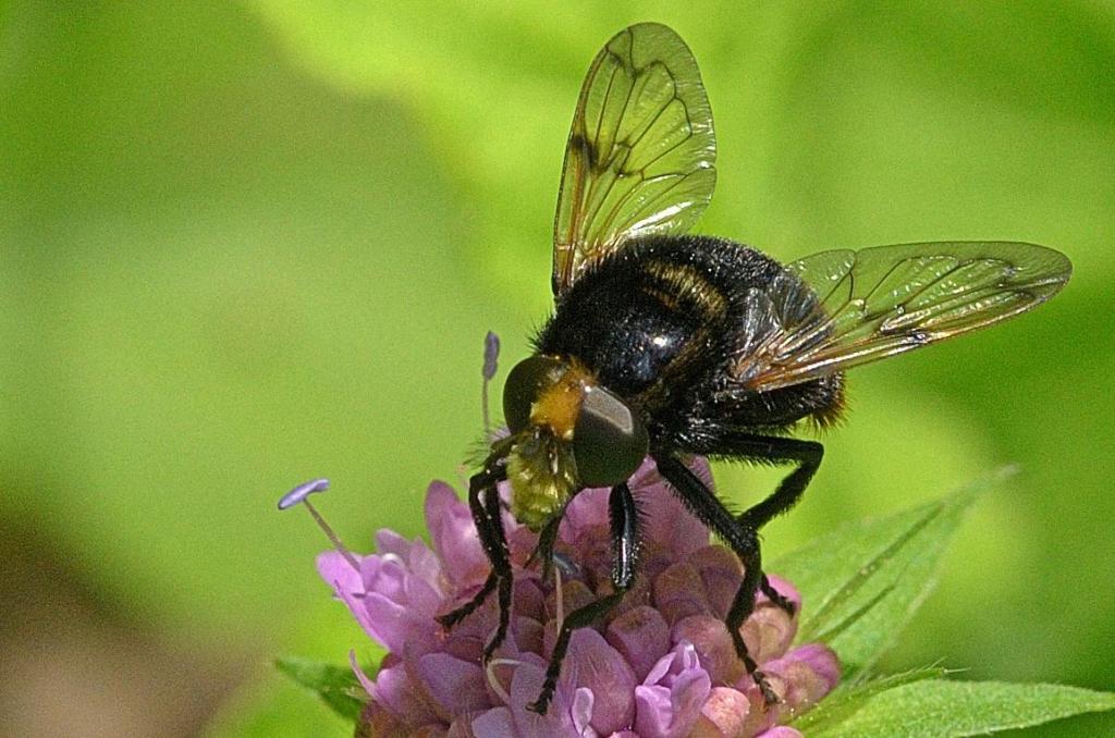Die ca. 10mm großen Fliegen sind an ihrem aufgeblasen wirkenden Kopf und dem eingerollten Hinterleib leicht zu erkennen. Die Maden parasitieren in Hummeln, die sie bis zur Verpuppung komplett aushöhlen.