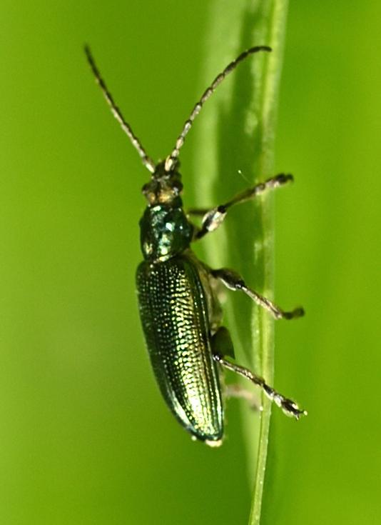 Auf den ersten Blick scheint dieser Käfer, von dem es viele Farbvarianten gibt, zu den Bockkäfernzu gehören, was durch seine knotigen Fühler noch unterstrichen wird. Aber er ist eindeutig den Blattkäfern zuzuordnen. Finden kann man diese Winzlinge in der Nähe stehender Gewässer an Blättern der Iris oder an Halmen von Sumpfgräsern.