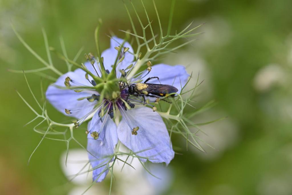 Dolchwespe auf der Blüte der Jungfer im Grünen (Nigella damascena), Hahnenfußgewächse (Ranunculaceae) verwandt mit dem echten Schwarzkümmel (Nigella sativa)