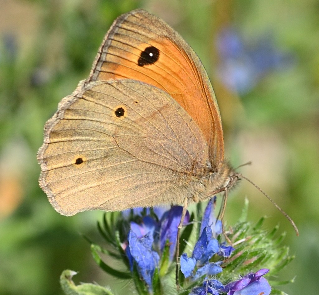 Großes Ochsenauge, Maniola jurtina, Nymphalidae (Edelfalter), Sexualdichroismus (Männliche und weibliche Exemplare sind unterschiedlich gefärbt. Vorkommen an Waldrändern, Trockenrasen und gehäuft auch in Gärten.